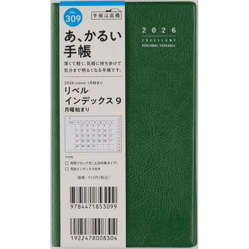 #高橋書店(日本国内のみ) 手帳 2026年 マンスリー リベル インデックス 9 緑 No.309 (2025年 11月始まり)