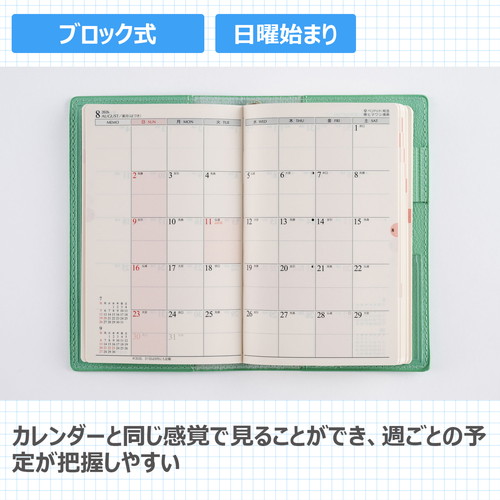 シンプルで機能性抜群!毎年のトレンドカラーから、試行を重ねたカバーデザイン。質感にもこだわり抜いています。※日曜始まり