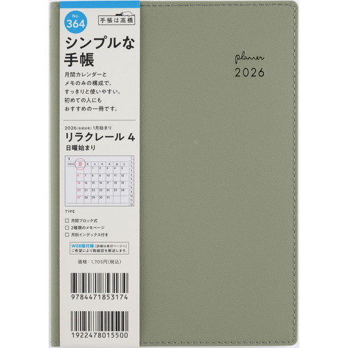 #高橋書店(日本国内のみ) 手帳 2026年 B6 マンスリー リラクレール 4 セージ No.364 (2025年 12月始まり)
