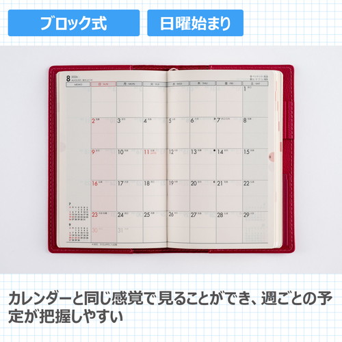 シンプルで機能性抜群!毎年のトレンドカラーから、試行を重ねたカバーデザイン。質感にもこだわり抜いています。※日曜始まり