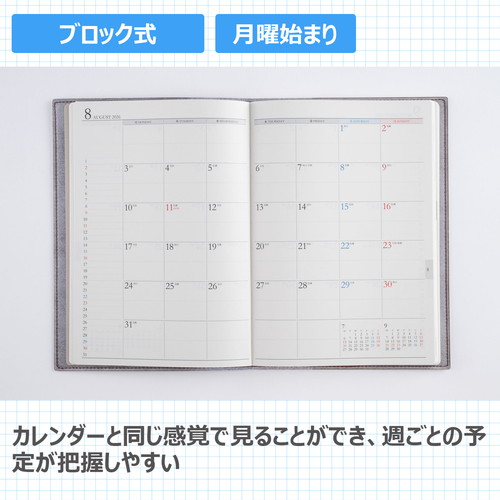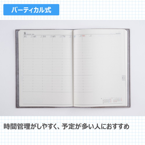 高級感とカジュアル感を兼ねた人気のダイアリーシリーズ月間予定表と週間予定表がまとまったタイプなので、月をまたがった予定管理にも便利。ベーシックな記入形式からお選びいただけます。