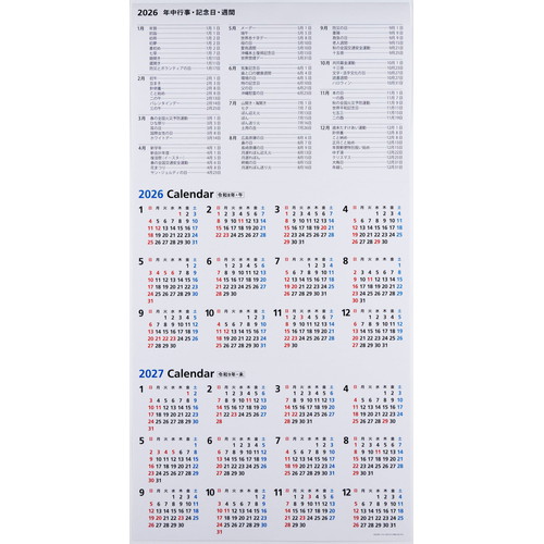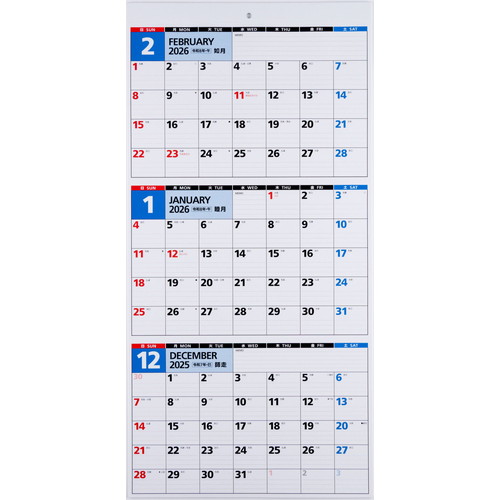 便利な3ヵ月一覧型のカレンダーです。先々の予定まで管理できる優れものです。常に3ヵ月分が一覧できるので、予定の先行管理がしやすいカレンダー。切り取り線入りで、使用後の保管も可能。【本体サイズ】607×300(mm)【曜日始まり】日曜始まり【記入形式】表面:ブロック式