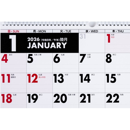 文字が太く、土日祝日に色が付いているので、見やすさ抜群。遠くからでも日付と曜日がはっきり分かります。【本体サイズ】297×420(mm)【曜日始まり】日曜始まり【記入形式】表面:ブロック式
