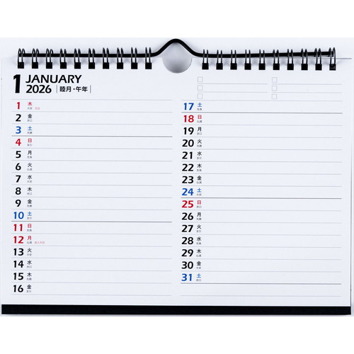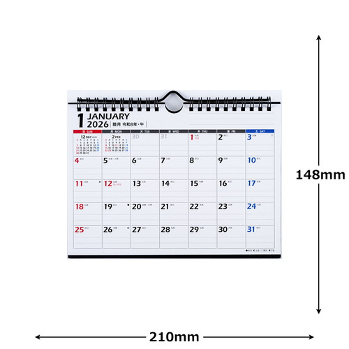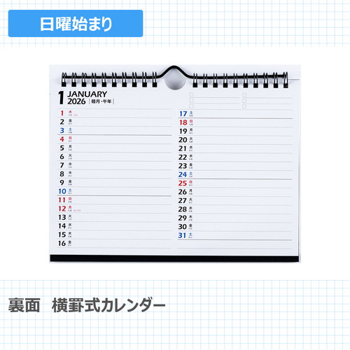 シンプルでスッキリとしたデザインのため、あらゆるシーンに対応。使い勝手の良い卓上カレンダーです。裏面は横ケイカレンダーになっており、両面使えます。ビジネスシーンにもぴったりの、すっきりとした見やすいカレンダーです。【本体サイズ】148×210(mm)【曜日始まり】日曜始まり【記入形式】表面:ブロック式 裏面:横ケイ式カレンダー