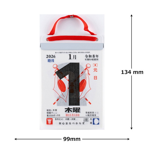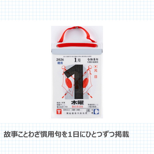本体サイズが134×99㎜の超小型の日めくりカレンダーなので、狭い場所にも掛けられます。旧暦や六曜、九星、干支、歳時記など、毎日の暮らしに役立つ情報や、故事ことわざ慣用句を1日にひとつずつ掲載。1年365日、めくるのが楽しくなります。【本体サイズ】134 × 99(mm)