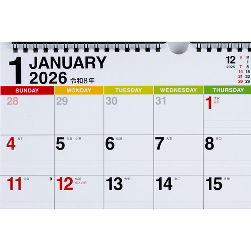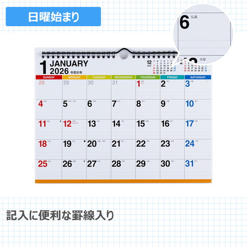 ポップな色使いの機能的なカレンダーです。1日のマスに2本の罫線が引かれているので、家族や予定ごとに書き分けられます。右上には前月・次月のミニカレンダー付きで、先々の予定の確認もばっちり。【本体サイズ】216×297(mm)【曜日始まり】日曜始まり【記入形式】表面:ブロック式