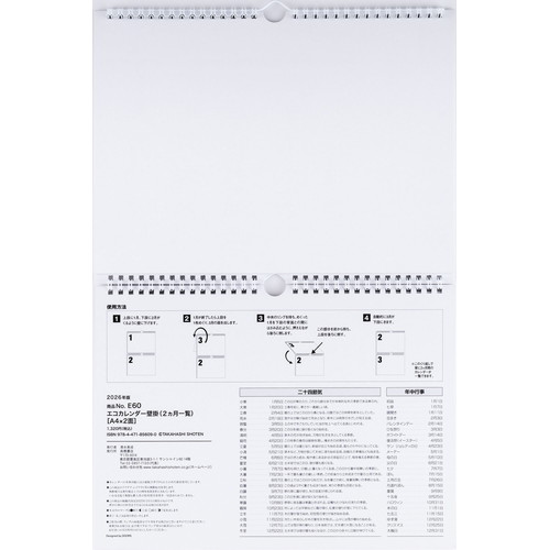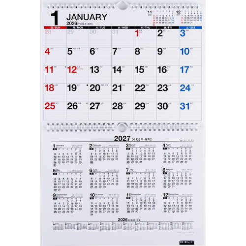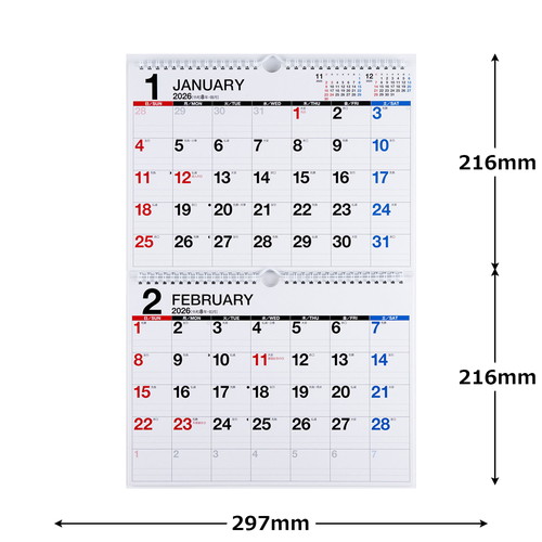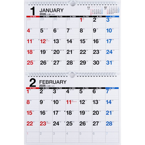 2ヵ月の予定を同時に見ることができるカレンダー。上下の月の位置を入れ替えることができる優れものです。シンプルなデザインで、広い記入スペースを確保しました。【本体サイズ】216×297×2面(mm)【曜日始まり】日曜始まり【記入形式】表面:ブロック式
