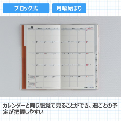 「薄さ」と「軽さ」が人気の土日均等タイプ。1冊目にはもちろん、趣味用のサブ手帳としてもオススメ。