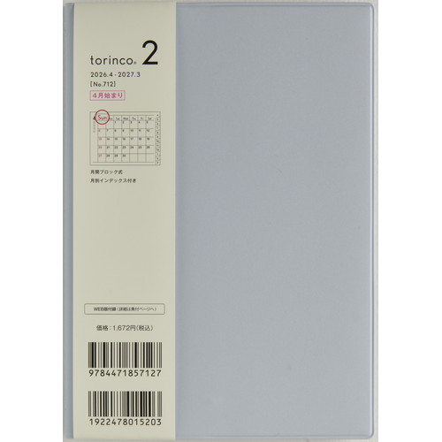 #高橋書店(国内販売のみ) 手帳 2026年 4月始まり マンスリー torinco 3 ソフトグレー No.731