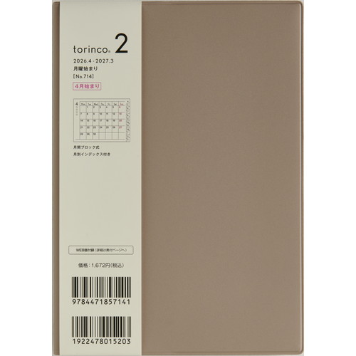 #高橋書店(国内販売のみ) 手帳 2026年 4月始まり B6 マンスリー torinco 2 グレージュ No.714