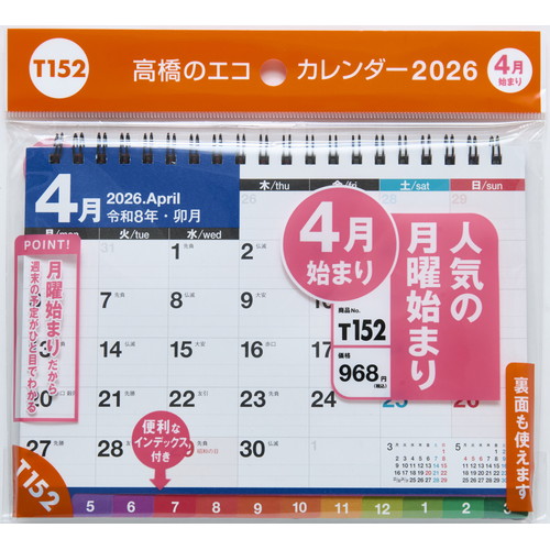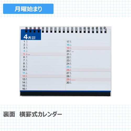 ビジネスの予定や、土日の予定が立てやすい月曜始まり。 表と裏で予定を書き分けるなど、自在に使えます。