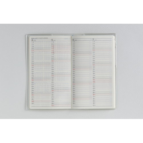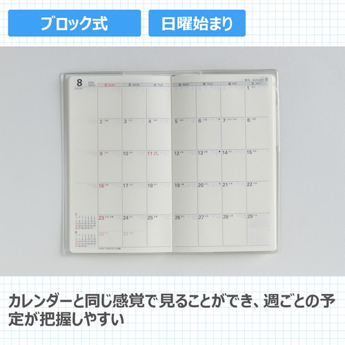 カレンダーと同じ感覚で見やすい日曜始まり。日?土の全ての記入欄が同じサイズの土日均等タイプ。