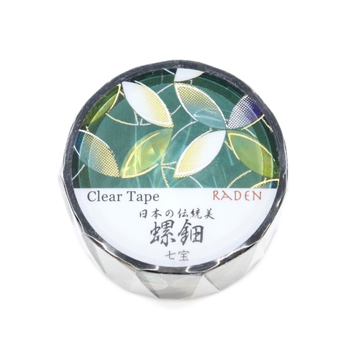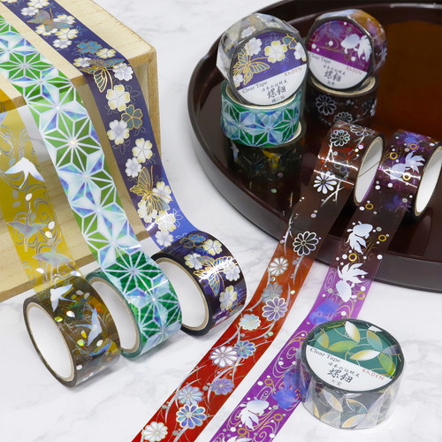 透明素材のテープに伝統的な螺鈿の印刷を行い、模様の繊細さを表現するためホログラム箔をグラデーションに加工にしています。透明テープはどこからでも手で切れるためストレスなくデコレーションが楽しめます。
