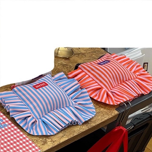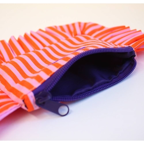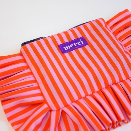 ストライプ柄×フリルが印象的なミニポーチです。大きく広がるフリルが可愛いアイテム。リップなどの小さなメイク道具や、イヤホンやコードなどのガジェット類、カードや小銭などを入れて財布として使うなど、使い勝手のいいサイズ感です。【仕様】[ポーチ部分のみ]H100×W130×D15mm