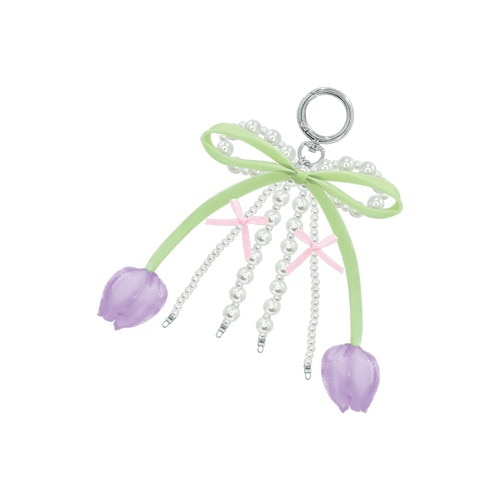 大小のリボンがゆらゆらかわいい!パール素材のチューリップとちびリボンが注目度抜群のキーホルダーです!カバンに付けても目立ってかわいい!