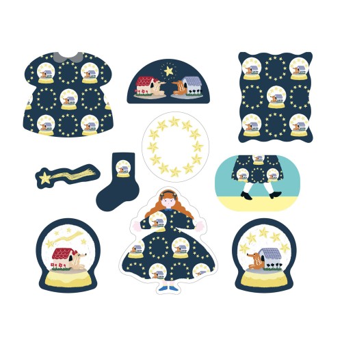お洋服を着替えるように軽やかに柄をたのしむフレークシールです。厚手の紙素材で透けにくく、ギフトに添えたり、手帳デコにもぴったりです。キュートなワンピース型のパッケージで、ポケット型の窓からシールが覗きます。陳列したとき、クローゼットのように見えて可愛いです。