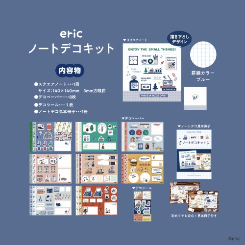 人気クリエイターのイラストがたっぷり!シール、ノート、デコレーションペーパー8枚、冊子の4点セット入った、豪華なノートデコキット。【検索ハッシュタグ】#ノート#ノートデコ#手帳#手帳デコ#クリエイター#デコレーション#eric