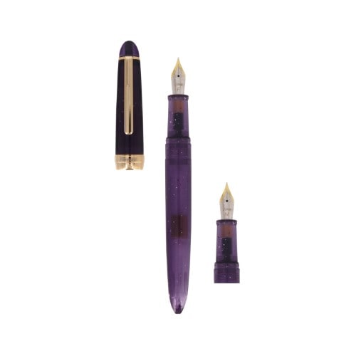 季節や時間ごとに移ろう空をイメージした万年筆。空に瞬く星々をイメージしたラメ入りのボディ。軸とキャップで微妙に異なる色合いは空の柔らかなグラデーションを表現。定番のF字ペン先に加え、付け替え可能なM字ペン先も付いたセット。M字のペン先は定番のF字よりも少し太めの文字が書け、インクをしっかり使った書き味に。インクの濃淡が出やすく、万年筆ならではのインクの表情を楽しめる。文字を書くだけではなく、アートな場面など、多彩な用途で活躍。