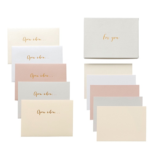 これから人生で迎える様々なシチュエーションを考えて、そのt気に読んでもらいたいメッセージを書く新しいレターの形です。「結婚〇年目の時」「家族が増えた時」「〇歳になった時」「友達とケンカした時」「落ち込んだ時」など、ウェディング、誕生日、入学、就職、送別など贈るシーンや相手も様々です。 サイズ:114x162mm カード110x155mm 内容:封筒10枚(5色x各2枚)、カード10枚(5色x各2枚)、説明書、ボックス