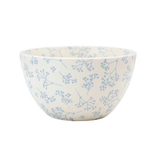 温かみのあるオフホワイトのベース色に、落ち着いた色合いの植物柄のデザイン。ボウルは内側にも絵柄を施しました。おもてなしにも普段使いにも。テーブルがぱっと華やぎます。