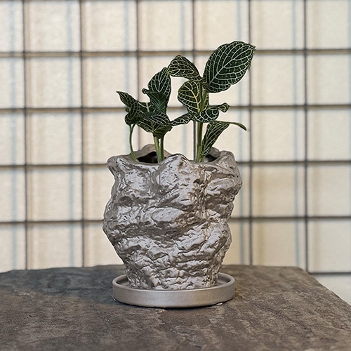 ゴツゴツした岩を思わせる特徴的なデザイン。オブジェのように空間を引き締めるアクセントとなります。底穴あり、受け皿あり。【検索ハッシュタグ】#陶器#鉢#植物#ポット#植木#植木鉢