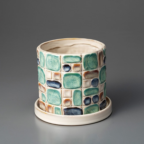 凹凸のあるブロック状の表情が印象的な、存在感あふれる植木鉢。一つひとつに異なる釉薬の濃淡が生まれ、手仕事ならではの奥行のある風合いを楽しめます。底穴あり、受け皿あり。【検索ハッシュタグ】#陶器#鉢#植物#ポット#植木#植木鉢#ブロック#凹凸
