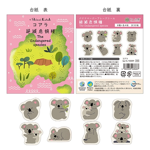 Shinzi Katohが絶滅危惧種の動物たちを描いたフレークシール。環境にやさしいバナナペーパーを使用し、売上の一部はIUCN-Jへ寄付され、絶滅危惧種の保護活動に役立てられています。