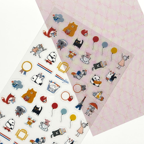 手帳やノートなどにデコレーションしやすい小さいサイズの透明素材のシールです。同じイラストが2柄ずつ入っているので、保存用にしたりお揃いやシェア使いも楽しめます。