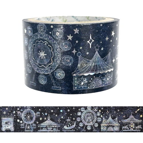 繊細な絵柄にホログラム箔を添えたワイド幅(27mm幅)の箔押しマスキングテープ。絵柄に合わせてゴールドとシルバー、2種の箔を使用されており、ワイド幅ならではの華やかさが、イラストレーターShinziKatohが描いた世界観を豊かに広げます。【検索ハッシュタグ】#マステ#幅広#遊園地#メリーゴーランド#観覧車#大人向け#箔押し#キラキラ#黒#washitape#デコレーション#コラージュ#手帳#ノート#可愛い#動物#文学#文具女子#剥がせる#