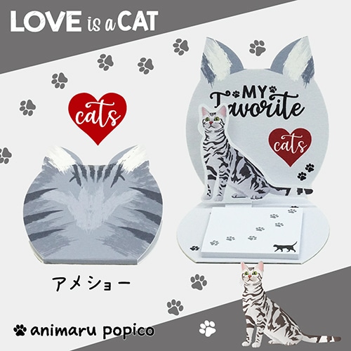 "アメリカンショートヘア"のねこの飛び出すしかけがついたふせん。 本体が猫の耳がついた頭の形になっており、さわり心地が猫の毛並みのような猫好きの心をくすぐる商品です。