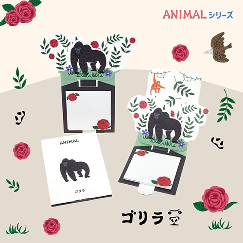 開くと"ゴリラ"が飛び出すしかけつきふせん。 付箋は花・植物デザインになっており、仕事場でも日常でも使いやすいデザインで、使わない時も飾って楽しめるかわいさと遊び心が詰まった商品です。