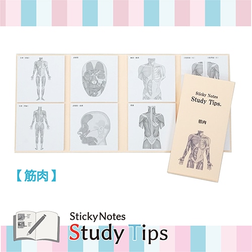 現役医師監修! 勉強するときに面倒な図の書き写し…。そんな時間を解消するために開発された筋肉付箋です。 蛍光ペンや色ペンなどを自由に使って効率的に学ぶことができるシンプルなデザインです。また書き込むことは学習効果を高め、より記憶に残りやすいとされています。 畳むとコンパクトになるので、持ち歩くのにも適しています。 付箋は20枚つづりになっており、繰り返しの復習するにもお友達におすそ分けするにも便利です。 スタイリッシュな外観は、いつでもサッと取り出して使うことができ、かっこよさも演出します。 ノートや壁に貼って使えます。 【筋肉】「全身(前面)」「全身(背面)」「表情筋」「表情筋・頭部」「胸部・腹部」「背部」「上肢前面・背面」「下肢前面・背面」全8柄【検索ハッシュタグ】#人体#筋肉#Sticky Notes Study Tips#スタディチップス#スタチプ#筋肉#からだのつくり#解剖生理学#理科#生物#医学#受験#勉強#筋トレ#筋肉痛#全身#表情筋#胸部#腹部#背部#上肢#下肢#医学生#病院#看護#ノート#実用的#便利#付箋#ふせん#メモ#塾#20枚綴り×8種類#紙季彩々#しきさいさい
