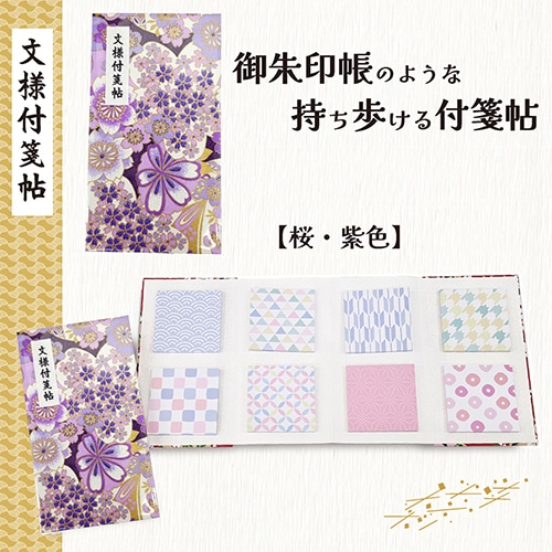 日本伝統文様柄の付箋(30枚)が8柄ついている御朱印帖のような付箋帖。 表紙に"紫色の桜柄"の友禅和紙を使用し、奉書紙には江戸小染めの花がら模様を使用した和を感じられる持ち歩ける付箋セットです。