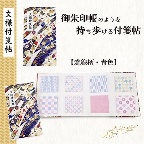 日本伝統文様柄の付箋(30枚)が8柄ついている御朱印帖のような付箋帖。 表紙に"流水模様"の友禅和紙を使用し、奉書紙には江戸小染めの花がら模様を使用した和を感じられる持ち歩ける付箋セットです。