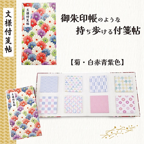 日本伝統文様柄の付箋(30枚)が8柄ついている御朱印帖のような付箋帖。 表紙に"カラフルな菊柄"の友禅和紙を使用し、奉書紙には江戸小染めの花がら模様を使用した和を感じられる持ち歩ける付箋セットです。
