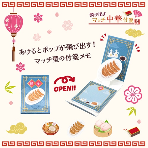 開けると桃まんが飛び出すしかけつきふせんの「中華」シリーズ。 マッチ風のパッケージを開けると、中華飯モチーフのデザインがポップアップ!使いやすい可愛いスクエア付箋30枚付き。