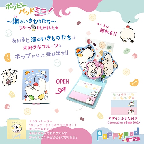 開けるとシロクマとアイスがポップアップ。飛び出すしかけつきふせんの「海のいきもの&フルーツ」シリーズ。 使って可愛い、飾って癒される♪ほっこりやわらかいイラストの"チナップ"さんのデザイン