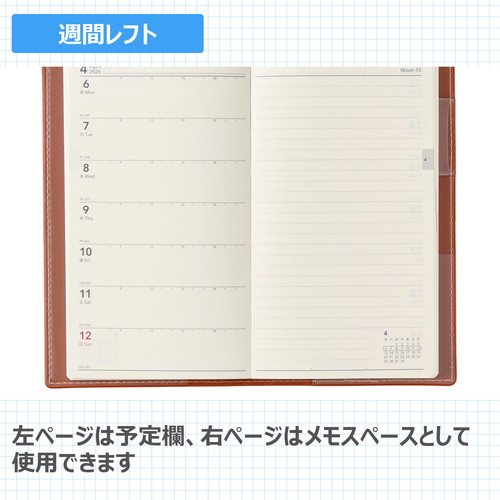 NOLTY(ノルティ)のシンプルウィークリー手帳。仕事にもプライベートにも使いやすい人気のスケジュール帳です。 【月間ページ】見開き1ヶ月のベーシックなブロックタイプ(月曜始まり)。 【週間ページ】見開き1週間のレフトタイプ(月曜始まり)。予定とメモにバランスよく使えるので、初心者にもおすすめのレイアウトです。 モデルチェンジ:・裏表紙のNOLTYのロゴマークを廃止し、より多くの人が使いやすいシンプルなデザインに変更しました。