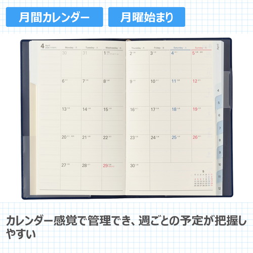 NOLTY(ノルティ)のシンプルウィークリー手帳。仕事にもプライベートにも使いやすい人気のスケジュール帳です。 見たい月をパッと開くことができる便利なインデックス付きです。 【月間ページ】見開き1ヶ月のベーシックなブロックタイプ(月曜始まり)。 【週間ページ】見開き1週間のレフトタイプ(月曜始まり)。予定とメモにバランスよく使えるので、初心者にもおすすめのレイアウトです。 モデルチェンジ:・裏表紙のNOLTYのロゴマークを廃止し、より多くの人が使いやすいシンプルなデザインに変更しました。