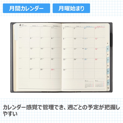 社会人にはもちろん、学生にもおすすめのウィークリーダイアリー 【月間ページ】見開き1ヶ月のベーシックなブロックタイプ(月曜始まり)。カレンダーと同じような感覚で見ることができ、週ごとの予定が把握しやすいのが特徴です。 【週間ページ】見開き1週間のレフトタイプ(月曜始まり)。予定とメモにバランスよく使えるので、初心者にもおすすめのレイアウトです。