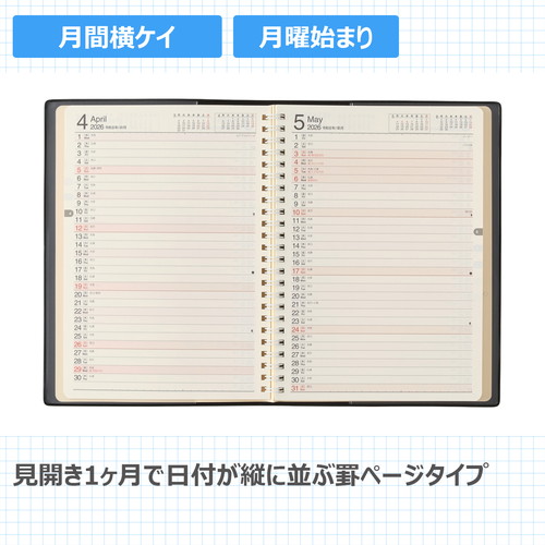 平らに開いて書きやすいNOLTY(ノルティ)のリング式ウィークリー手帳 【月間ページ】見開き2ヶ月で日付が縦に並ぶ罫ページタイプのレイアウト。長期の予定やプロジェクト管理に便利です。 【週間ページ】見開き1週間のレフトタイプ(月曜始まり)。予定とメモにバランスの良い手帳です。