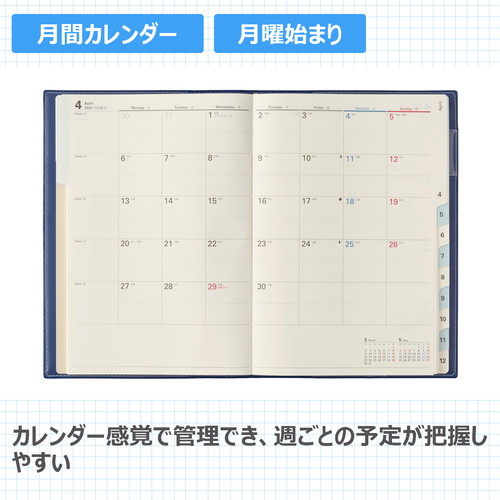 月間と週間が連続したページ構成で、月ごとにまとめて予定を組むのに適しているNOLTY(ノルティ)人気のウィークリー手帳。 【月間ページ】見開き1ヶ月のベーシックなブロックタイプ(月曜始まり)。カレンダーと同じような感覚で見ることができ、週ごとの予定が把握しやすいのが特徴です。 【週間ページ】見開き1週間で、左右のページに日付が分割されているメモタイプのレイアウト(月曜始まり)。1日分のスペースが広いので、日記などの記録に便利です。 モデルチェンジ:・製本を変更し開きやすくなりました