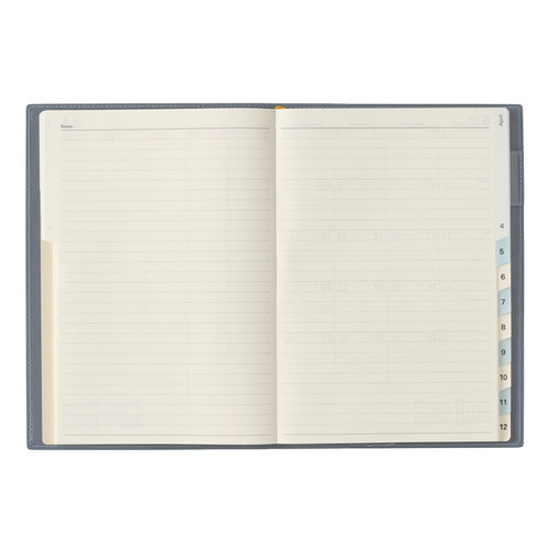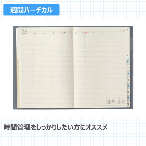 月間と週間が連続したページ構成で、月ごとにまとめて予定を組むのに適しているNOLTY(ノルティ)人気のウィークリー手帳。 【月間ページ】見開き1ヶ月のベーシックなブロックタイプ(月曜始まり)。カレンダーと同じような感覚で見ることができ、週ごとの予定が把握しやすいのが特徴です。 【週間ページ】見開き1週間で全面に時間軸を配置したバーチカルタイプにメモスペースも確保した充実のレイアウト。細かなスケジュール管理に加え、その週のメモも取りたいという方におすすめです。 モデルチェンジ:・製本を変更し開きやすくなりました