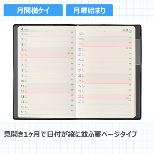 NOLTY(ノルティ)の長年愛されるビジネス手帳 【月間ページ】日付が縦に並ぶ罫ページタイプのレイアウト。長期の予定やプロジェクト管理に便利です。 【週間ページ】見開き1週間で左ページに予定、右ページはメモスペースとして使えるレフトタイプ(月曜始まり)。予定とメモにバランスの良い手帳です。 モデルチェンジ:・裏表紙のNOLTYのロゴマークを廃止し、より多くの人が使いやすいシンプルなデザインに変更しました。