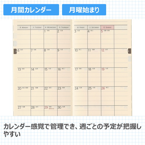 週間ページ下部の両角に切り取りミシンがあり、しおり代わりに使えて検索性も抜群。 【月間ページ】見開き1ヶ月のベーシックなブロックタイプ(月曜始まり)。 【週間ページ】見開き1週間で、月曜~金曜を中心に時間軸を配置したバーチカルタイプ。 モデルチェンジ:・裏表紙のNOLTYのロゴマークを廃止し、より多くの人が使いやすいシンプルなデザインに変更しました。