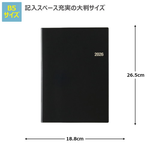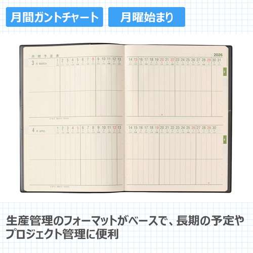 メモページがノート1冊分以上あり、手帳とノートを一括管理したい人におすすめの能率手帳。 【月間ページ】見開き2ヶ月で日付が横に並ぶガントチャートタイプのレイアウト。長期の予定やプロジェクト管理に便利です。 【週間ページ】見開き1週間で左ページに予定、右ページはメモスペースとして使えるレフトタイプ(月曜始まり)。予定とメモにバランスの良い手帳です。