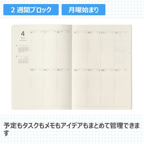予定もタスクもメモもアイデアも。専用手帳カバーにダイアリーとノートをまとめて収納できるNOLTY(ノルティ)のTiO(ティオ)シリーズ ティオはノートタイプの手帳となります。(汚れや水に強いPP加工を採用した紙の表紙の手帳です) ■自分らしくカスタマイズ■ さまざまな組み合わせができるシンプルなダイアリーとノート、カバーをご用意しました。セットして使うことでシーンや気分に合わせ自分らしく使えます。 ■組み合わせでも単独でも■ 使いやすさを第一に。ダイアリーもノートも細部までこだわり抜いて設計しました。 ダイアリーの表紙は、汚れや水に強いPP加工を採用。カバーと組み合わせても、手帳単独でもご使用頂けます。 2週間ブロックタイプはノートとの組み合わせはもちろん、マンスリータイプと組み合わせても便利に使えます。 モデルチェンジ:・印刷インデックスが入りました