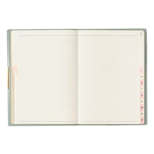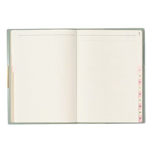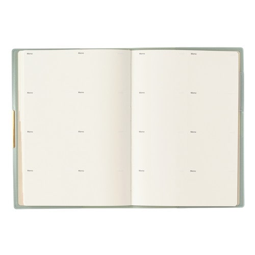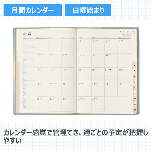 PAGEM by NOLTY(ペイジェム バイノルティ)のマンスリー手帳、グラースB6シリーズは、金具付きでステッチのような箔のデザインが縁に施されているエレガントな表紙が特長です。 【月間ページ】ダブルマンスリータイプが人気の月間ブロックタイプ(日曜始まり)。すっきりとしたデザインのレイアウトで、ストレスなく予定を書き込めます。各月ごとに罫ページが付いているので、その月のできごとをメモするのに便利。 ※表紙を変更しました