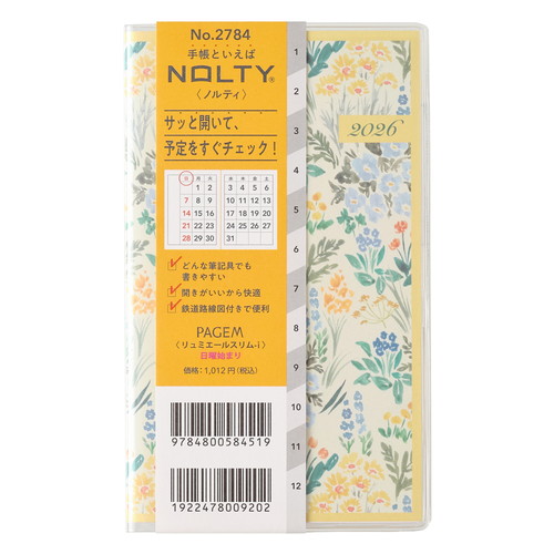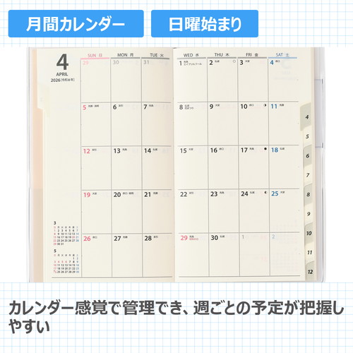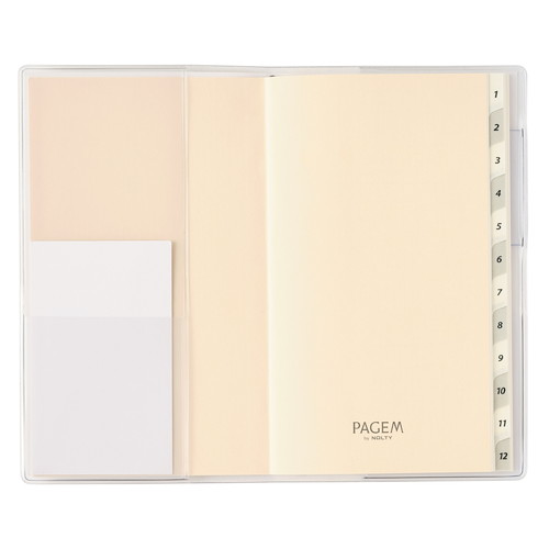 PAGEM by NOLTY(ペイジェム バイノルティ)のマンスリー手帳シリーズは、1ヵ月の予定をパッと見渡すことができ、スリムなので持ち運びの際にもかさばらないのが特長です。 【月間ページ】見開き1ヵ月のベーシックなブロックタイプ(日曜始まり)。カレンダー感覚で月ごとの予定が把握しやすいのが特長で、見たいページをパッと開けるインデックス付きです。 リバーシブル表紙(裏面は柄のないデザインです) ※表紙を変更しました