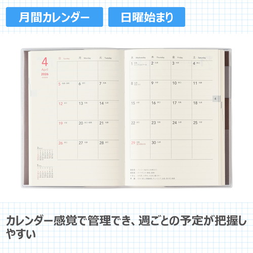 PAGEM by NOLTY(ペイジェム バイノルティ)シリーズの日記帳 【月間ページ】見開き1ヵ月のベーシックなブロックタイプ(日曜始まり)。カレンダーと同じような感覚で見ることができ、月ごとの予定が把握しやすいのが特長です。 【日記欄】見開きで2日分の記録ができるデイリータイプ。予定だけでなく、日記やイラストを書いたり、スクラップブックとして活用するなどさまざまな用途に使えるレイアウトです。